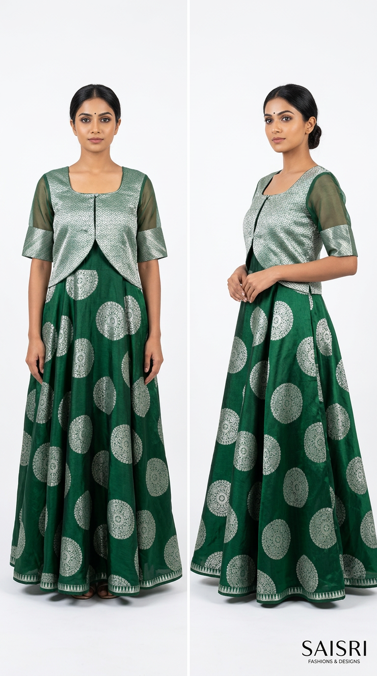 Product Title: Banaras Gown with Silver Printed Work & Jacket Sleeves (Size XL)