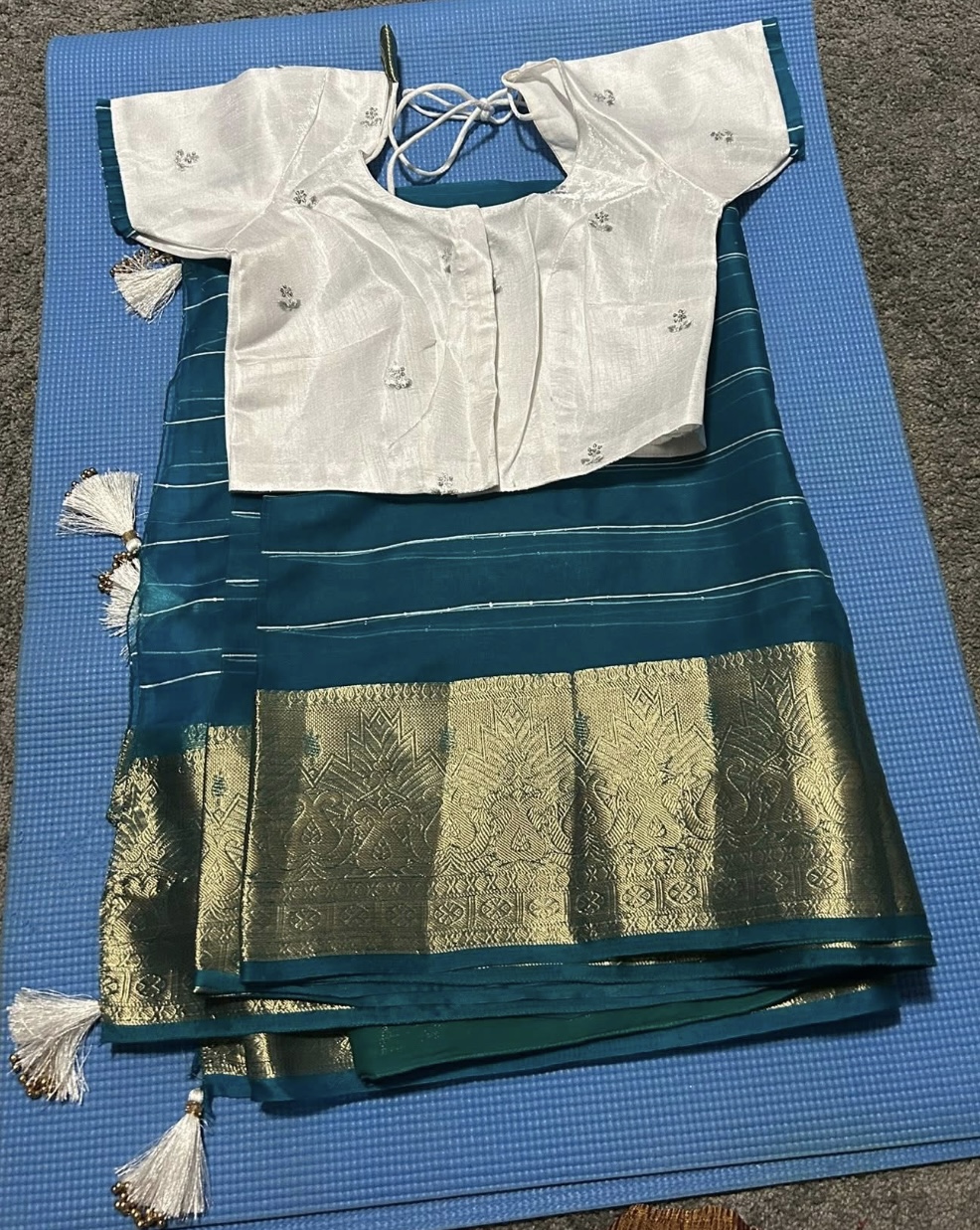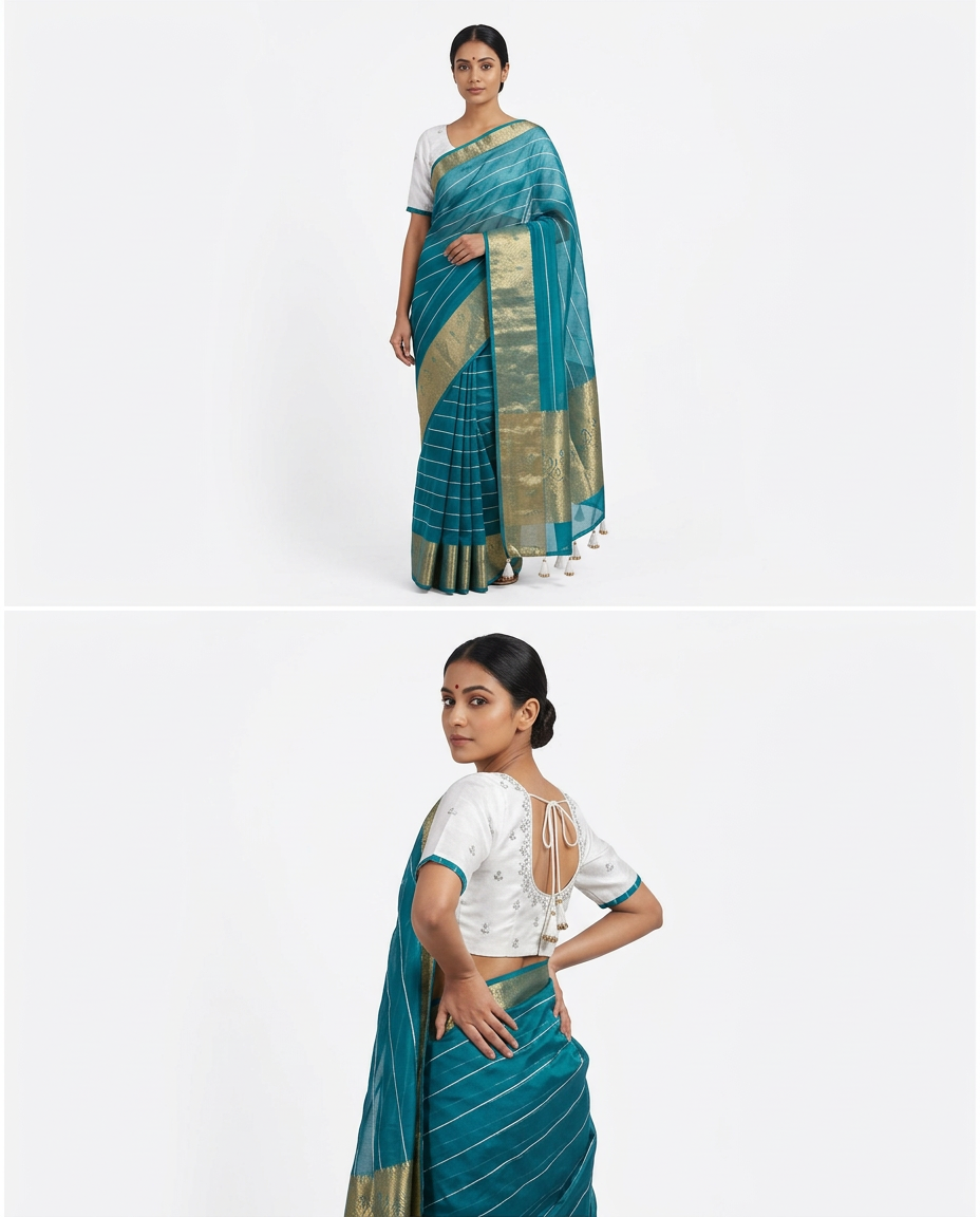 This saree comes with a stitched blouse, offering convenience and a polished ready-to-wear style. The delicate tassels enhance the overall design, adding a trendy and fashionable finish to the saree.