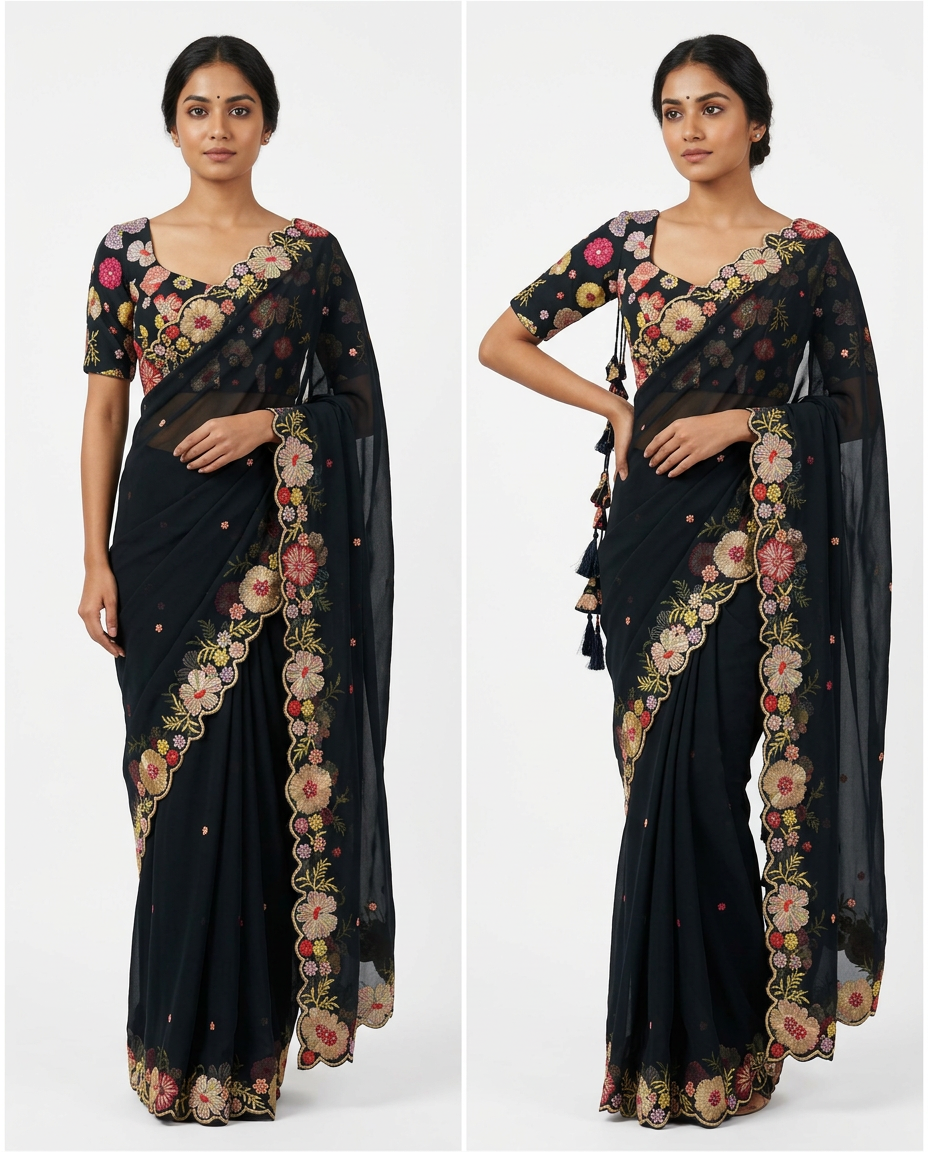 The saree comes with a perfectly stitched blouse, making it convenient and ready to wear. The intricate embroidery detailing adds a touch of sophistication and traditional elegance, making it ideal for parties, festive celebrations, and family functions.